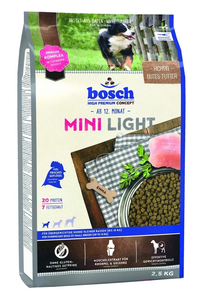 Plnohodnotné, vyvážené a kompletní krmivo pro psy malých plemen s nižším obsahem energieBosch granule pro psy Mini Light byly vyvinuty speciálně pro dospělé psy malých ras (do 15,0 kg konečné váhy) se sklonem k nadváze. Bosch Mini Light je kompletní krmivo s velmi redukovaným obsahem energie (jen...