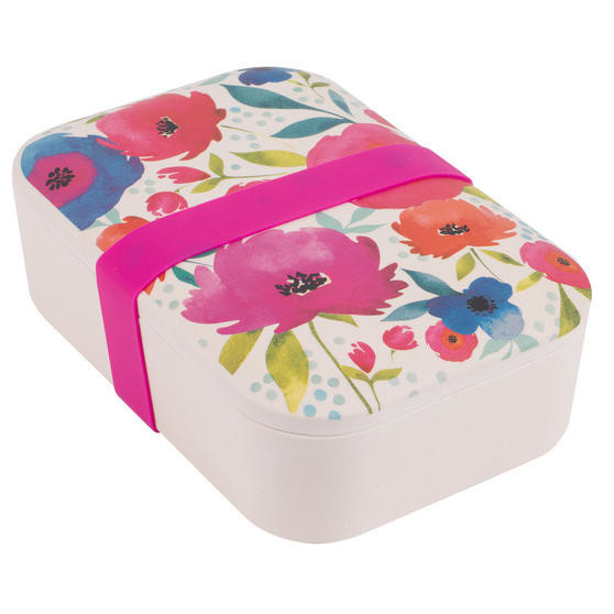 Praktický lehký a hlavně ekologický svačinový box vyrobený z bambusu s krásným květinovým vzorem a růžovým silikonovým páskem. przeczytaj całość