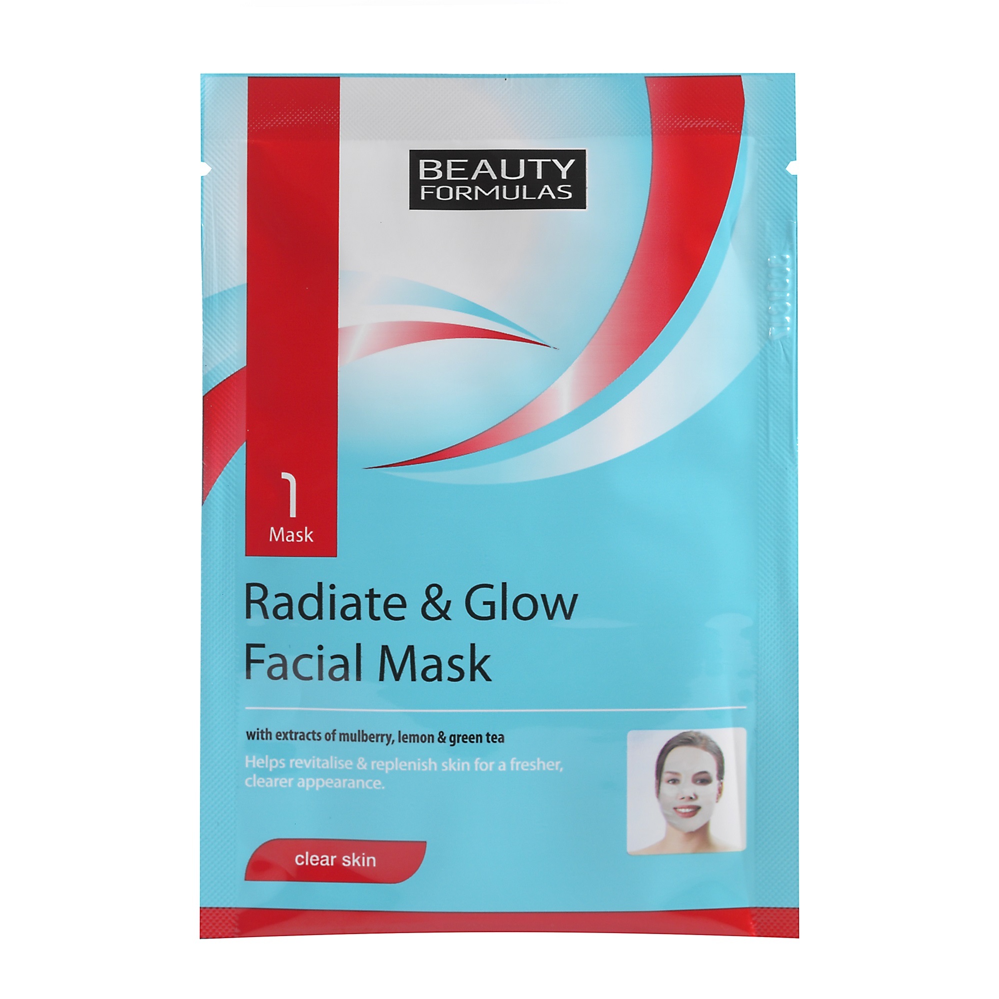 Maska na obličej Clear Skin Radiate & Glow Brightening Facial Mask s moruší, citrónem a zeleným čajem, je speciálně vyvinutá, předem zvlhčená maska pro regeneraci pokožky pomocí přírodních ingrediencí, které pomáhají obnovit a doplnit jas a záři pokožky pro krásnější a zářivější vzhled.