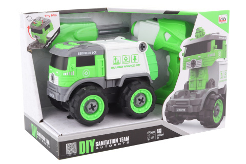 Śrubokręcowy zdalnie sterowany samochód-śmieciarka. Samochód można zmontować za pomocą dołączonego śrubokręta lub wiertarki. Z wiertarki można wyjąć silnik, który wkłada się do samochodu, a następnie porusza się on sterowany do przodu i do tyłu. Samochód można także przekształcić w robota. Pojazd wydaje dźwięki i świeci. Zasilanie: 4 baterie AAA (nie dołączone) oraz 3 baterie LR41 (dołączone). Wymiary samochodu: ok. 15 x 10,5 x 10 cm. Wymiary opakowania: ok. 26,5 x 17,5 x 14 cm. Wiek 3+