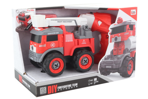 Samochód strażacki do skręcania, zdalnie sterowany. Auto można skręcić za pomocą dołączonego śrubokręta lub wkrętarki. Z wkrętarki można wyjąć silniczek, który wkłada się do auta, a następnie porusza się ono do przodu i do tyłu za pomocą pilota. Auto można również przekształcić w robota. Samochód wydaje dźwięki i świeci. Zasilanie: 4 baterie AAA (brak w zestawie) oraz 3 baterie LR41 (w zestawie). Wymiary auta: ok. 15 x 14 x 10 cm. Wymiary opakowania: ok. 26,5 x 17,5 x 14 cm. Wiek: 3+