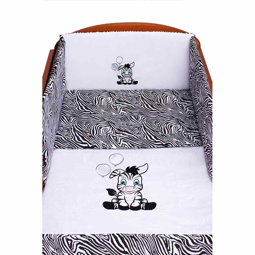 Dětská bavlněná 5-dílná souprava do postýlky New Baby Zebra pro miminka. Soupravu zdobí veselý obrázek zebry s pruhy a je celopotištěná výraznými černobílými pruhy. Je vyrobena z měkkého, příjemného materiálu. Souprava obsahuje povlečení na polštářek cca 40x60 cm, povlečení na peřinku cca 100x135...