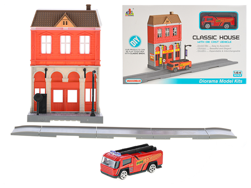 Hasičská stanice skládací s autem hasiči 7cm kov na volný chod v krabičce