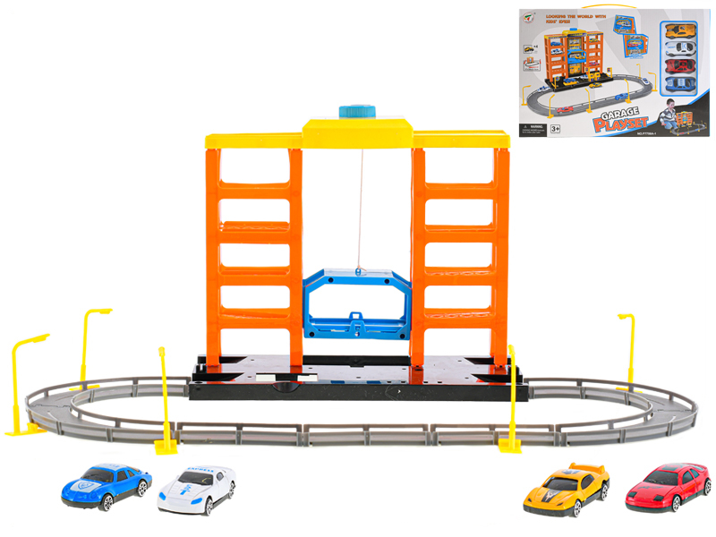 Parkovací garáž 57x36x22,5cm s výtahem a auty 6,5cm 4ks volný chod v krabičce