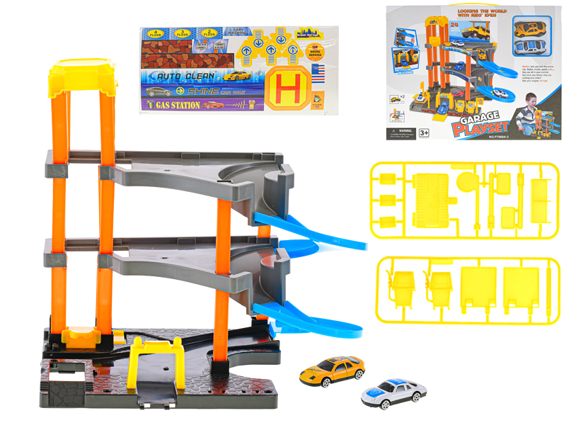 Parkovací garáž 37x25x30cm s výtahem + 2ks auta 6,5cm na volný chod v krabičce