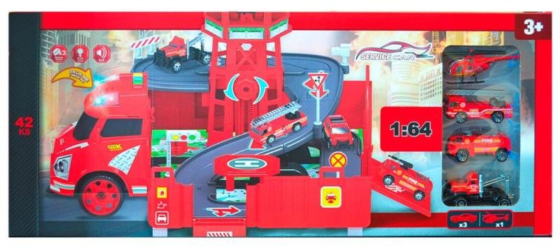 Hasičská stanice garáž s příslušenstvím (sada) Rozměr garáže po rozložení: 46,5 × 49 × 29 cm, tlačítka pro zvukové a světelné efekty, jízda na volnoběh, funkce „ZKUS MĚ“ Aktivace funkce ZKUS MĚ: Vyjměte pojistku ze zásobníku baterií, kterou naleznete na kabině auta a vyzkoušejte funkce stiskem...
