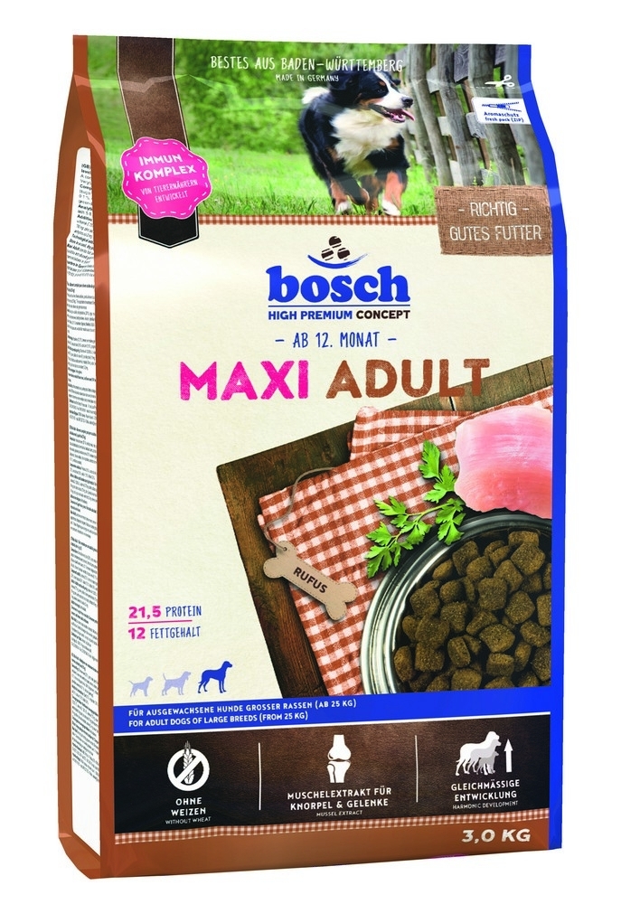 Bosch Maxi Adult je kompletní krmivo pro dospělé psy velkých plemen. Je u něj kladen důraz na lehkou stravitelnost, dostatečnou výživu, ochranu a posílení kloubů a chrupavek a zkvalitnění srsti. Velká plemena mají specifické výživové nároky, které Bosch dokáže zcela pokrýt.Nižší koncentrace...