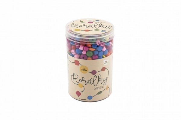 Korálky dřevěné barevné s gumičkami cca 800 ks ve velké plastové dóze 10x15cm