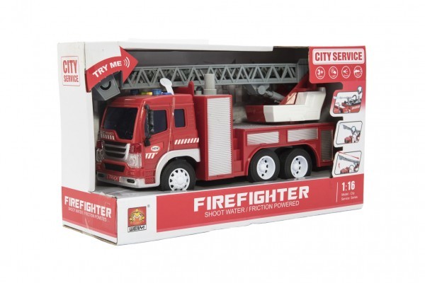 Auto hasiči stříkací vodu 30cm plast na setrvačník na bat. se zvukem se světlem v krabici 32x18x12cm
