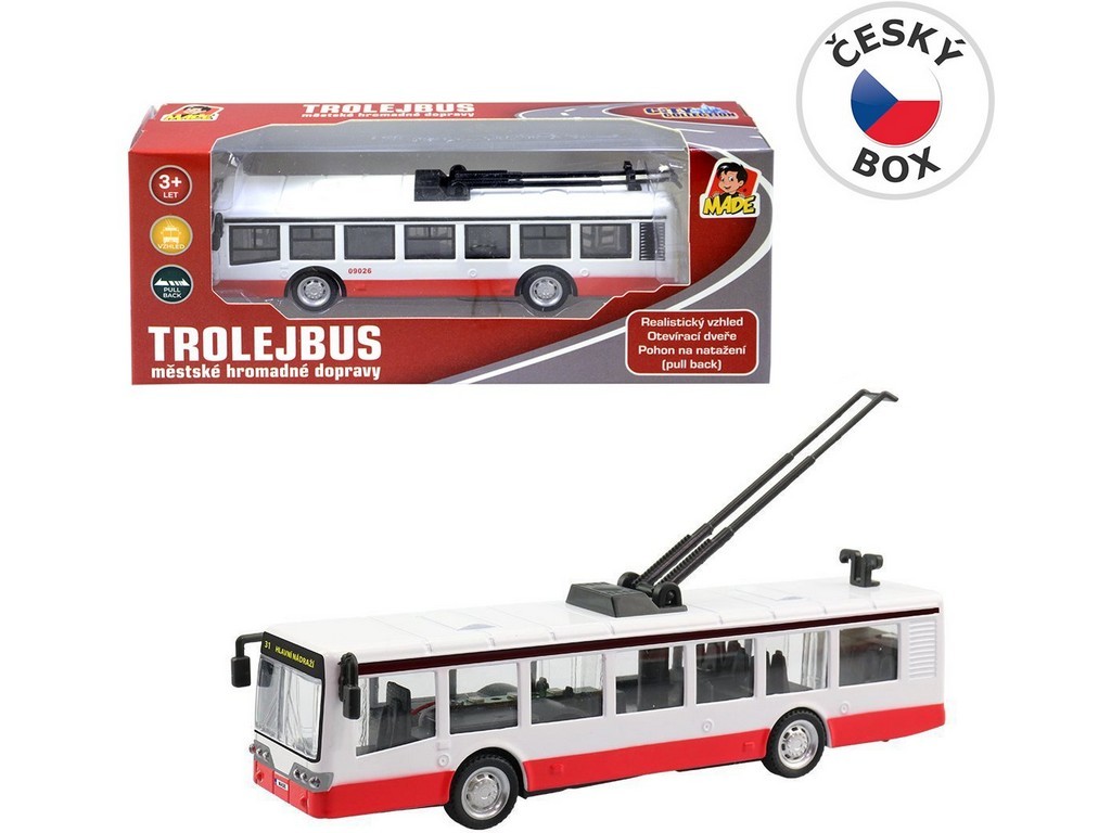 Metalowy trolejbus o realistycznym wyglądzie w czeskim wzornictwie. Świetny prezent dla wszystkich miłośników miejskich środków transportu. Czerwono-biało-czarna kombinacja kolorystyczna jest widoczna w pojazdach komunikacji miejskiej w niektórych naszych miastach. Trolejbus posiada składane odbieraki prądu oraz otwierane drzwi. Napęd na naciąganie (pull-back). Wymiary trolejbusu to ok. 16 x 3 x 3 cm. Materiał: połączenie metalu i plastiku. Zalecane dla dzieci od 3 lat.