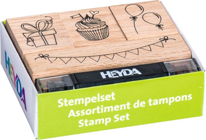 Razítkovací set párty 4ks obsahuje i polštářek modrý a černý. Razítka jsou upevněna na dřevěném bloku. Vhodné pro použití i s jakýmkoliv inkoustem, který máte k dispozici.