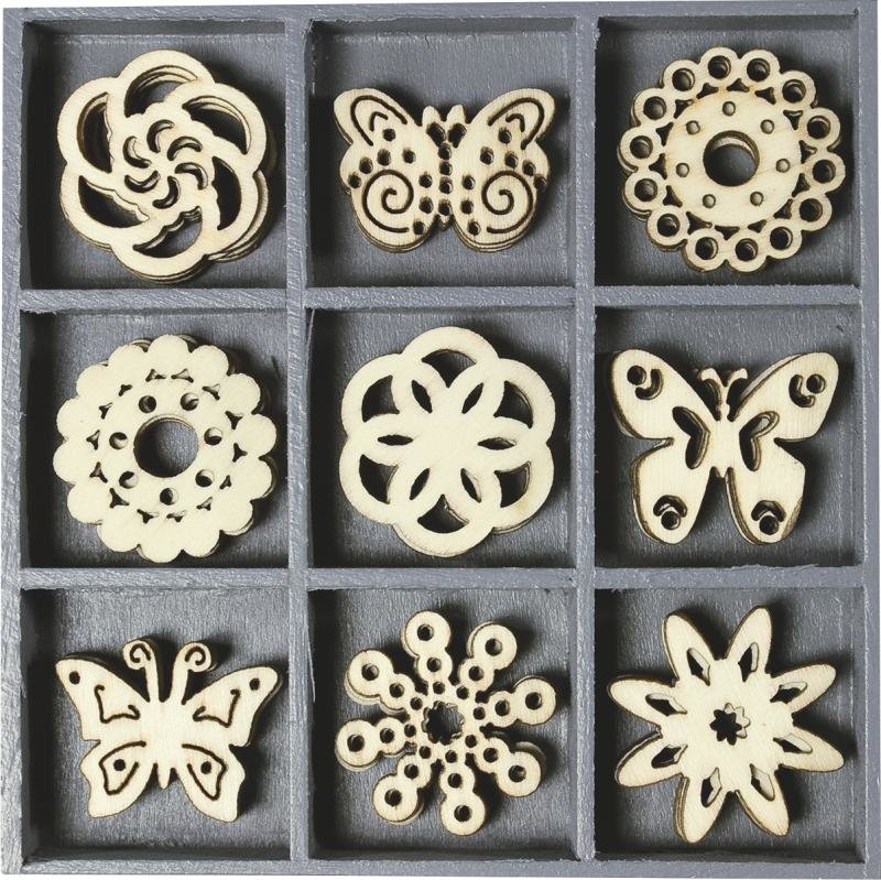 Drewniane ozdoby w praktycznym pudełku, 9 wzorów po 5 sztuk. Wymiary jednego motywu ok. 3 cm x 3 cm. Idealne do ozdabiania kartek, prezentów, pudełek itp. przeczytaj całość