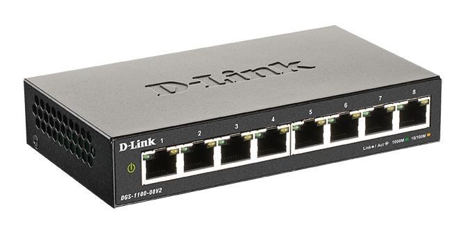 DGS-1100-08V2/ED-Link DGS-1100-08V2 8-port Gigabit Smart Managed switchD-Link DGS-1100-08V2 je 8-portový Gigabit Smart řízený přepínač v kompaktním kovovém provedení bez ventilátorů, pro položení na stůl, na poličku nebo montáž na zeď. Nabízí základní sadu L2 funkcí (např. VLAN, QoS, IGMP...