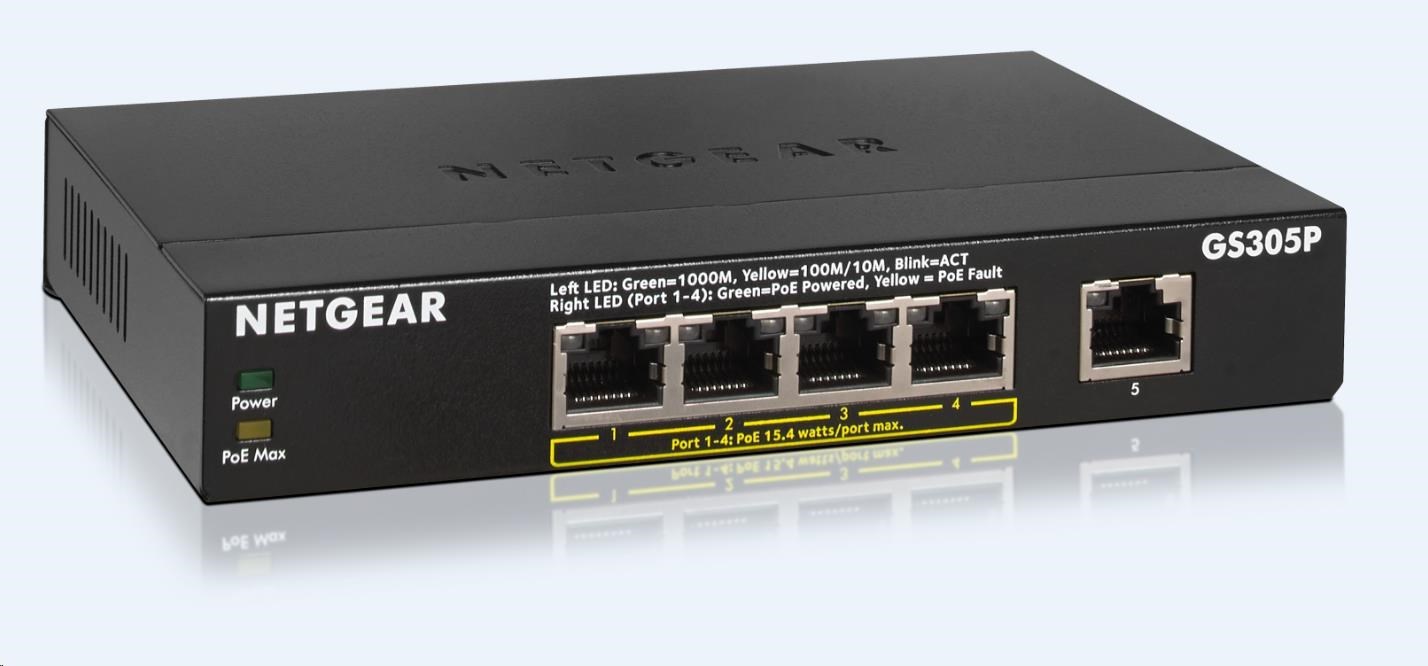 Netgear GS305P Gigabit Switch 5 portů, 4 porty jsou PoE, PoE budget 55W