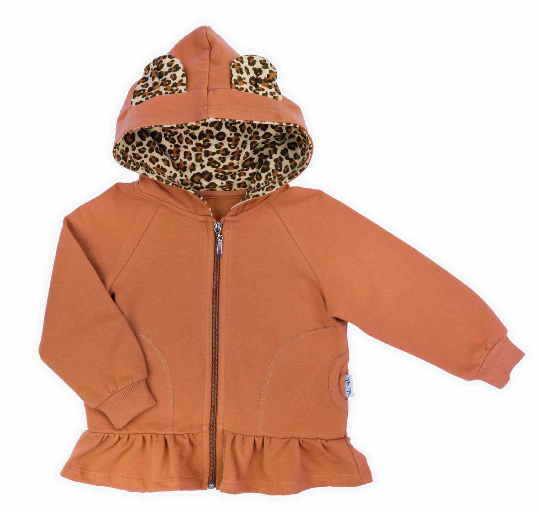 Kojenecká mikinka s kapucí Nicol Mia. Mikinka má zapínání na zip po celé délce, pružný lem na rukávcích a je ukončena roztomilým volánkem. Kapuci zdobí roztomilá ouška a podšívka je zdobena vzorem leopardí srsti. Mikinka je delší a tím skvěle nahradí tenčí kabátek, nebo svetřík. Fantazie v...