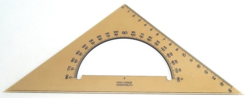 Trójkąt 45/177 z kątomierzem wykonany z dymionego przezroczystego polistyrenu. Skale nadrukowane technologią precyzyjnego sitodruku. Nadruk skal jest odporny na ścieranie podczas normalnego użytkowania. Dokładność skali długości 0,2% długości. Oprócz skali długości na przyprostokątnej trójkąt wyposażony jest w wycięcie łukowe z podziałką kątomierza 0-180° do pomiaru i rysowania kątów. Trójkąt przeznaczony jest do rysunku technicznego i kreślenia w szkole i w biurze. Zaletą jest połączenie trójkąta z linijką i kątomierzem 180° w jeden produkt. Zapakowany jest w woreczek polietylenowy z zawieszką typu euro.