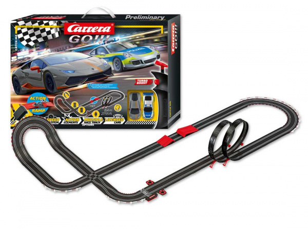 Autodráha Carrera GO!!! dlouhá 8,4m s auty Lamborghini Huracán a policejni Porsche 911 (s majáčkem), obsahuje skokánek, křižovatku, klopenou zatáčku, looping, zúžení dráhy, rovinky, zatáčky, díl s počítadlem kol a další díly. Můžete si sestavit další různé trati podle plánu na obalu.Délka trati:...