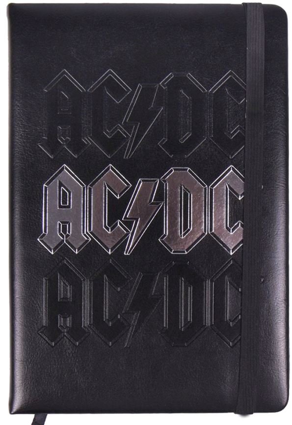 Černý zápisník ve formátu A5 bez linek s logem skupiny AC/DC na přední straně. Zápisník má 240 stran.