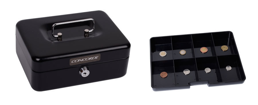 Kovová pokladna vyrobená z bezešvého ocelového plechu , přihrádka na mince, uzamykatelná, přenosná. 195 x 145 x 75mm. przeczytaj całość