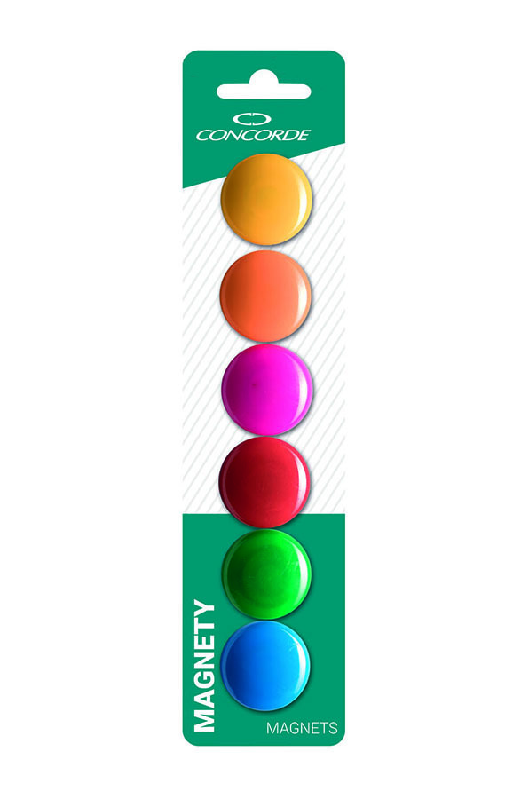 Kolorowe, okrągłe magnesy o średnicy 30 mm. Średnica wewnętrznego magnesu 1,5 mm. Magnesy nadają się praktycznie wszędzie - np. na tablice ogłoszeń, flipcharty, tablice suchościeralne czy lodówki. Opakowanie zawiera 6 sztuk na blistrze. przeczytaj całość