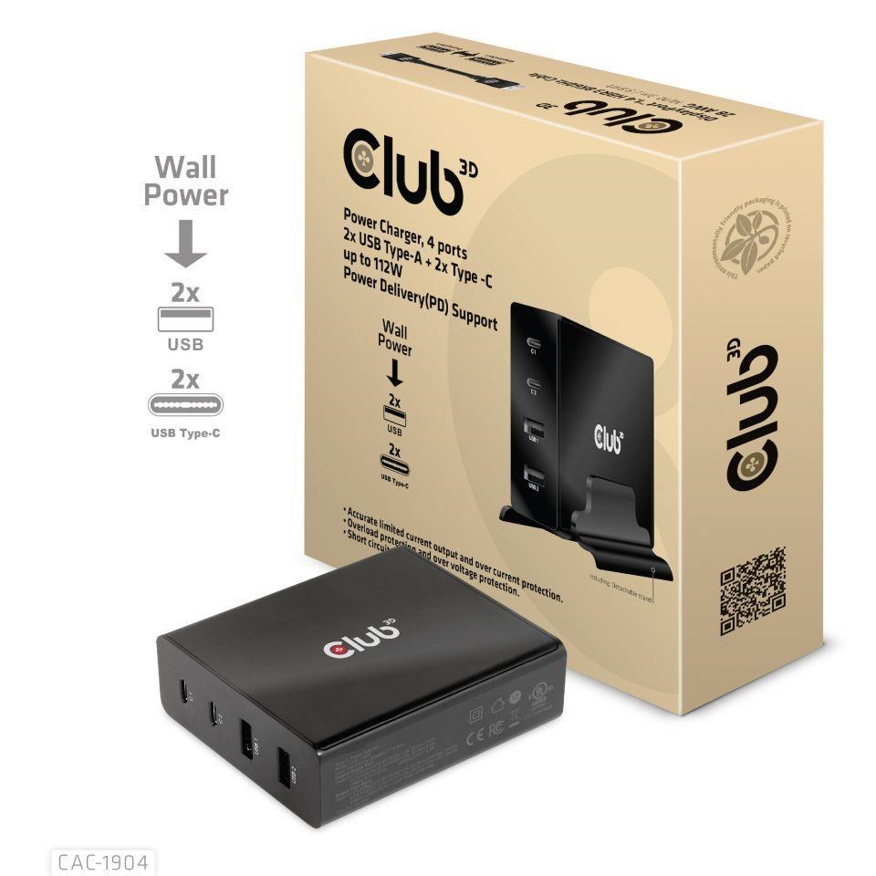 Power Charger, 4 ports, 2x USB Type-A 2x Type-C up to 112W, Power Delivery(PD) SupportThe Club3D CAC-1904 Power Charger, 4 ports, 2x USB Type-A + 2x Type-C up to 112W, Power Delivery(PD) Support is designed for users who want to use only 1 Power Charger for their PC/Laptop/Tablet/Mobile phone as...