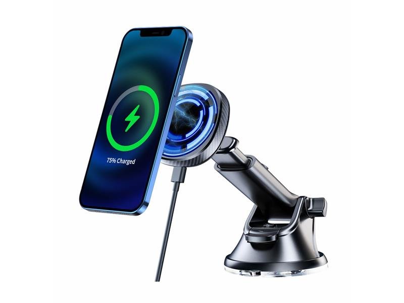 Magnetyczny uchwyt z przyssawką, wysuwanym ramieniem, bezprzewodowym ładowaniem kompatybilnym z MagSafe o wysokiej mocy do 15W. Pakowany w blister SWISSTEN.