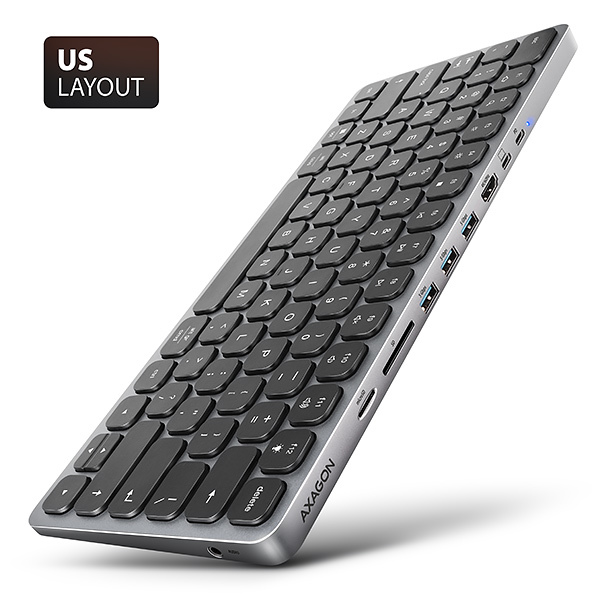AXAGON HMC-KB-US, USB 5Gbps hub s US klávesnicí, HDMI 4K/60Hz, 3x USB-A, SD/mSD, audio, PD 100W, kabel USB-C 60cm