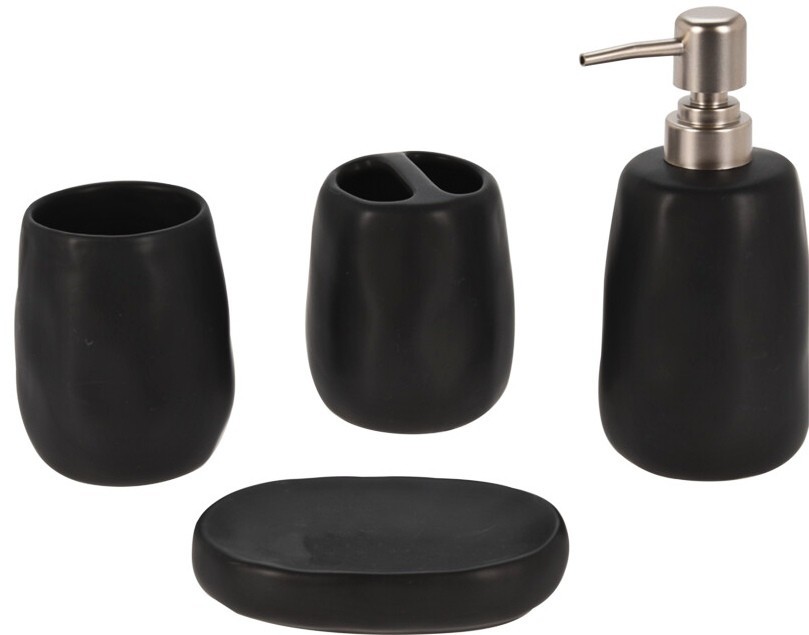 - sada doplňků do koupelny - vyrobené z keramiky v matné černé barvě - sada 4 ks obsahuje: - dávkovač na mýdlo 7 x 17 cm - držák na zubní kartáčky 7 x 10 cm - pohárek 8 x 10 cm - miska na mýdlo 12,5 x 8,5 x 3 cm - barva: černá / stříbrná - značka: Homestyling przeczytaj całość