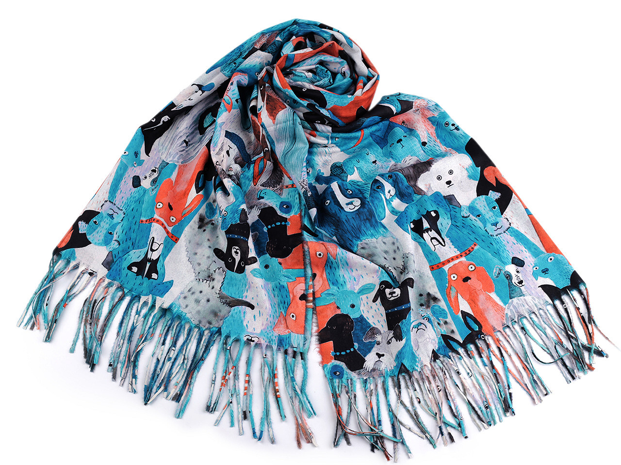 Velká šála typu kašmír je vyrobená z hřejivého materiálu, který je příjemně hebký na dotek. Je ozdobená obrázky různých pejsků. Krásně vás zahřeje v chladném a sychravém počasí. Na koncích je zakončená střapci.
