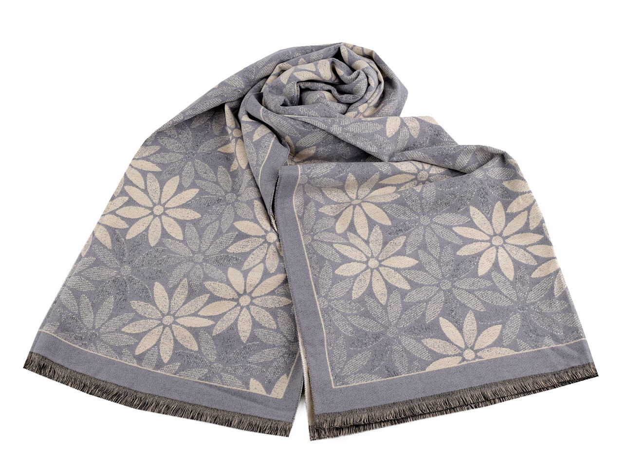 Šátek / šála typu kašmír s třásněmi, květy 60x180 cm - 1 ks - 7 šedá světlá