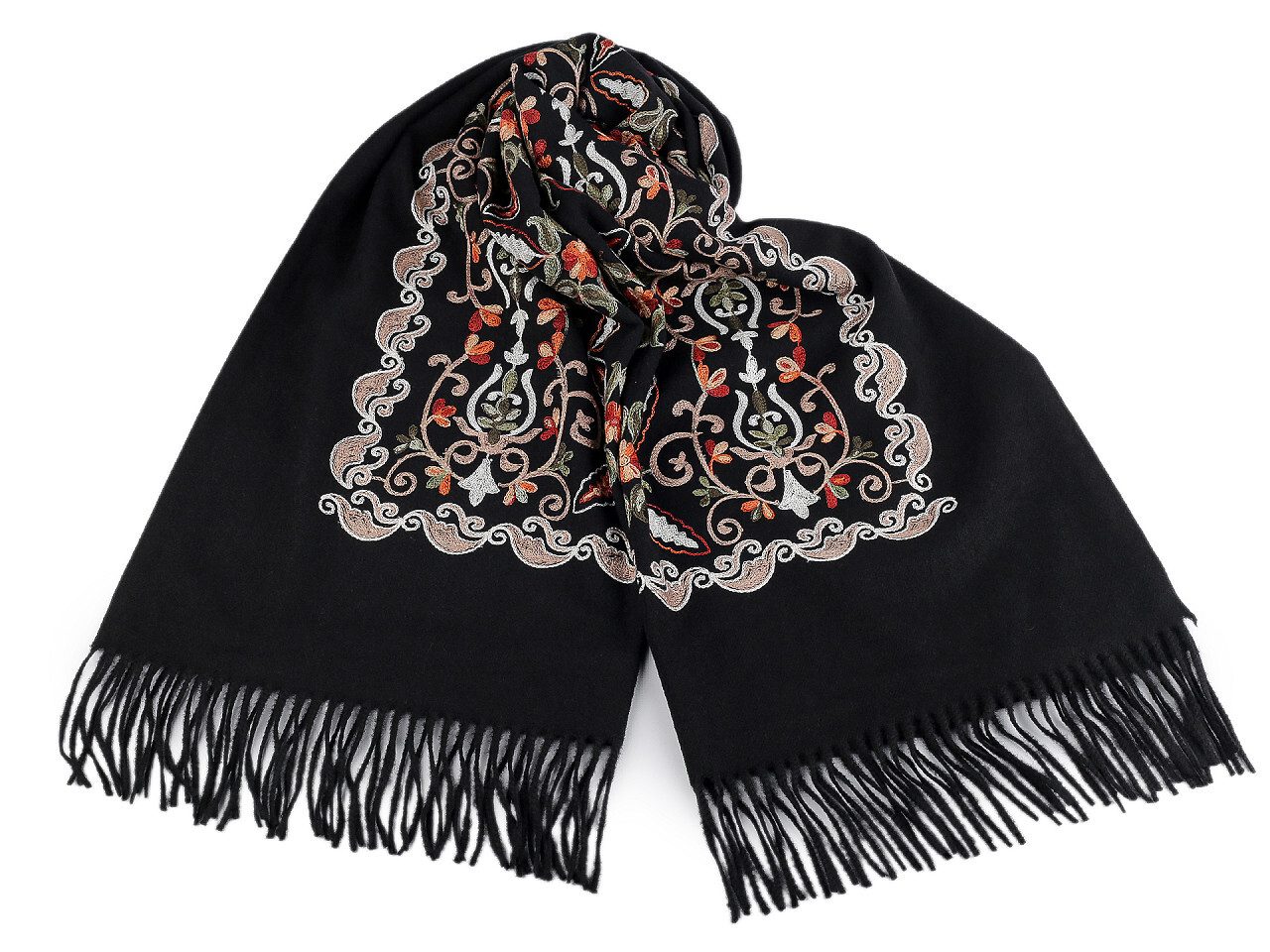 Velký teplý šátek / pléd vyšívaný s třásněmi, typu kašmír 70x180 cm - 1 ks - 4 černá multikolor