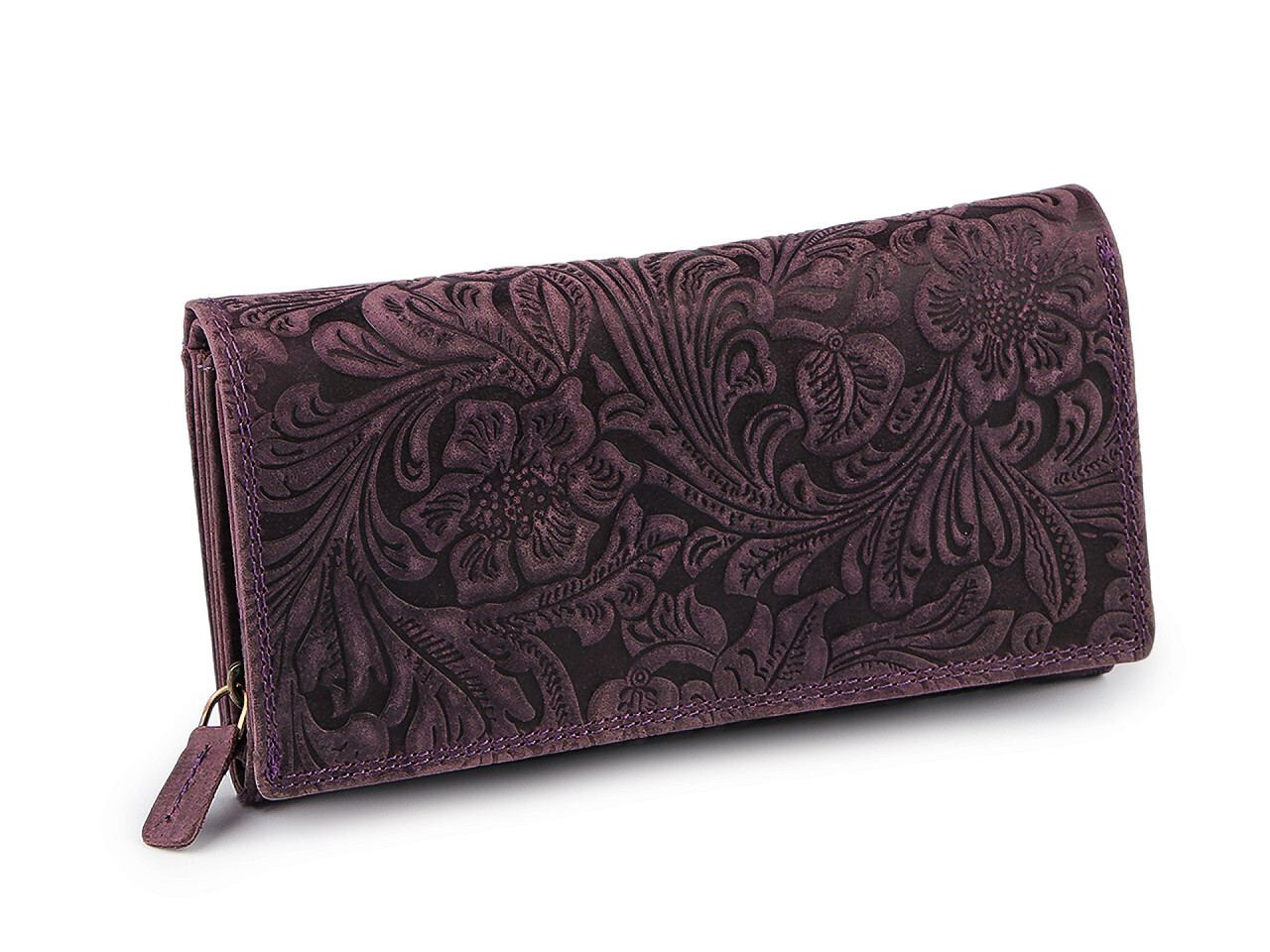 Dámská peněženka kožená s květy - 1 ks - 33 borůvková