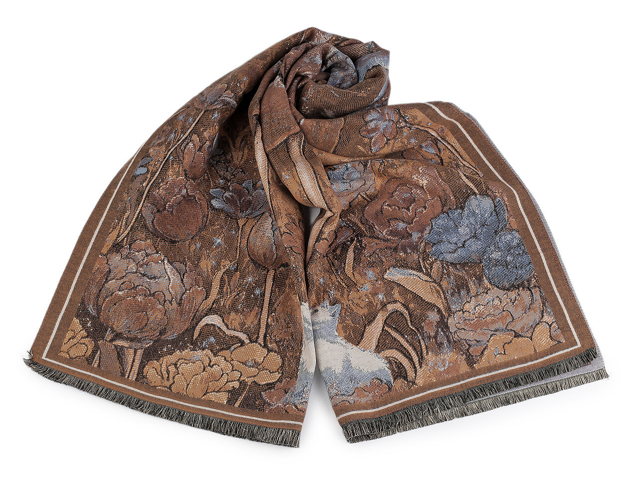 Velký luxusní šátek typu kašmír je ozdobený květinovým motivem. Je vyrobený z hřejivého materiálu, který je příjemně hebký na dotek. Pefektně vás zahřeje v chladném a sychravém počasí. Hodí se ke kabátu, bundě i svetru. Na koncích je zakončený krátkými třásněmi.Šátky typu kašmír jsou téměř dva...