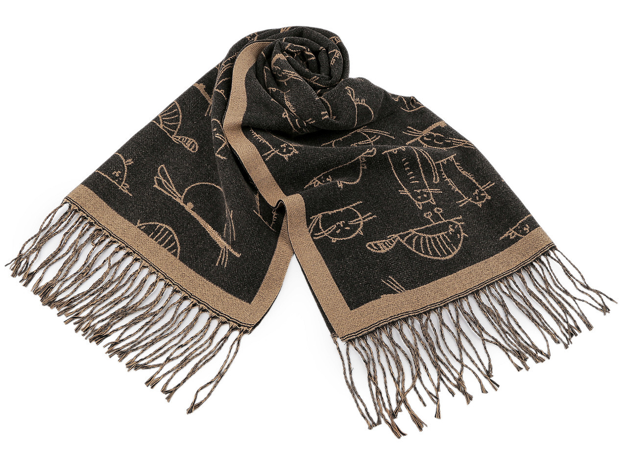 Zimní šála / pléd s třásněmi, kočky 65x180 cm - 1 ks - 18 černá béžová