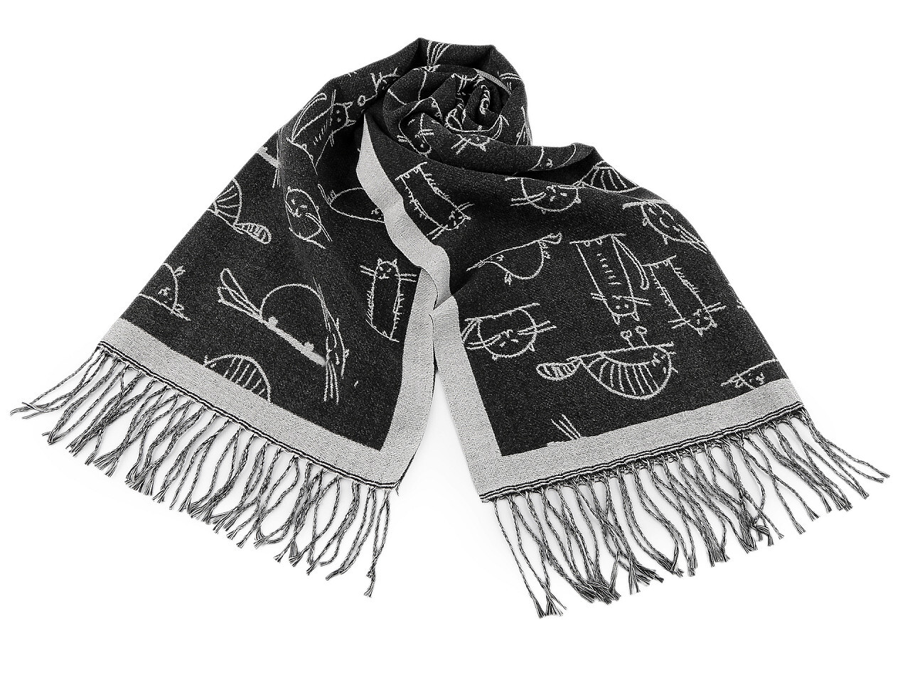 Zimní šála / pléd s třásněmi, kočky 65x180 cm - 1 ks - 19 černá šedá světlá