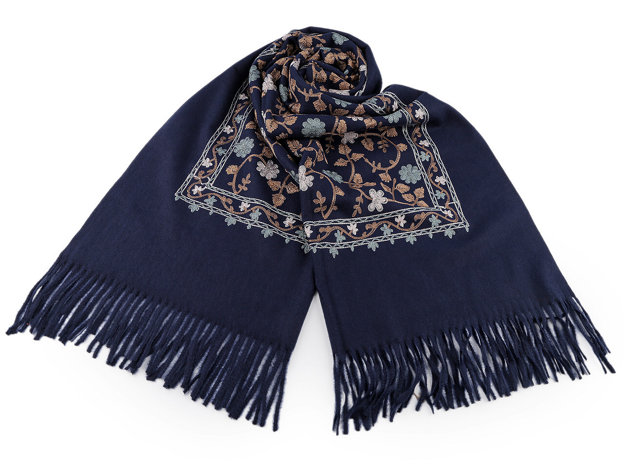 Velký teplý šátek / pléd vyšívaný s třásněmi, typu kašmír 68x165 cm - 1 ks - 6 modrá tmavá