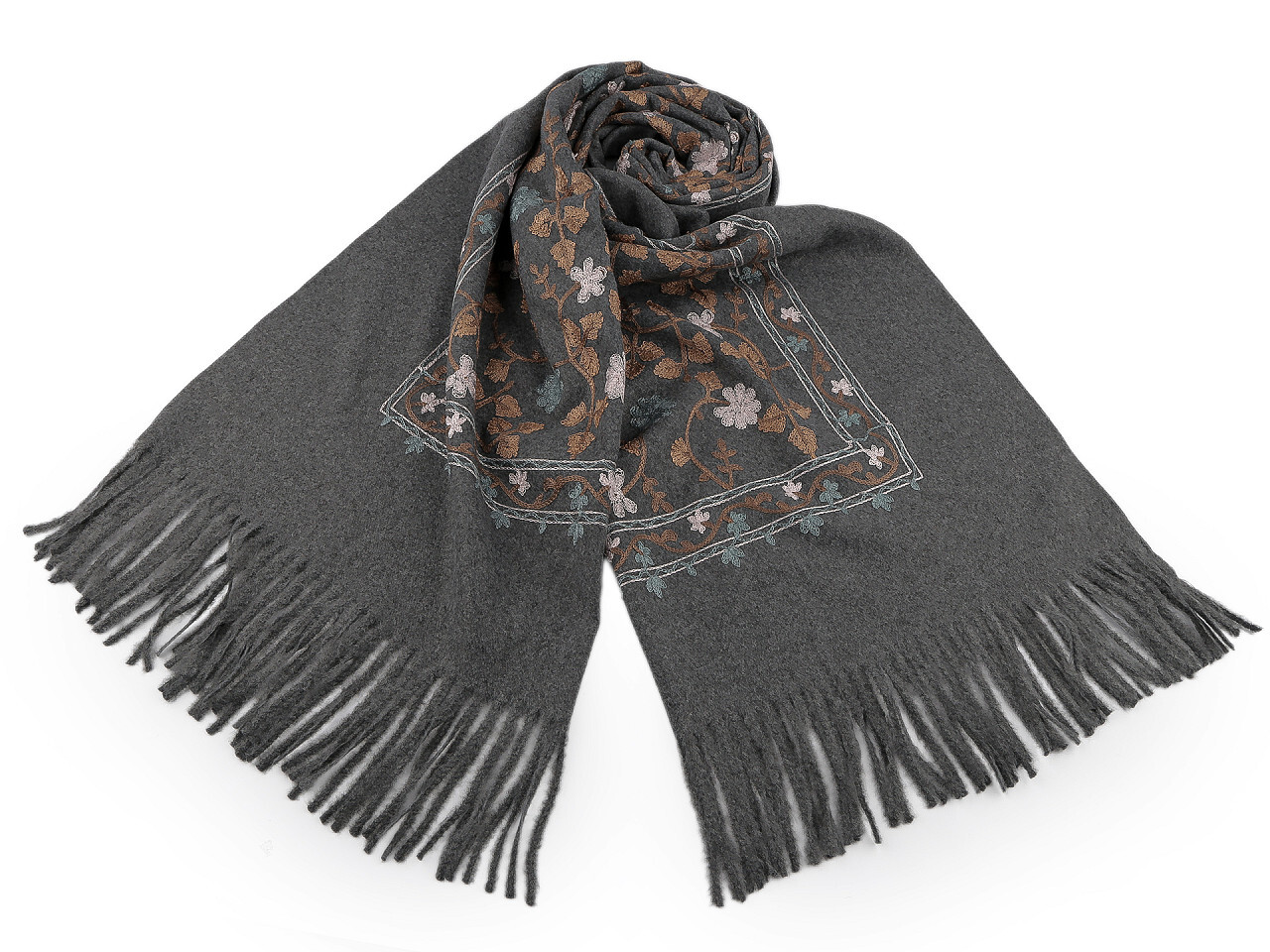 Velký teplý šátek / pléd vyšívaný s třásněmi, typu kašmír 68x165 cm - 1 ks - 8 šedá