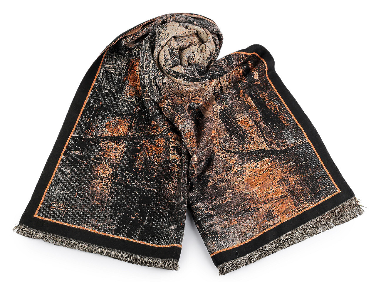 Velký luxusní šátek typu kašmír je ozdobený propracovanými motivy. Je vyrobený z hřejivého materiálu, který je příjemně hebký na dotek. Krásně vás zahřeje v chladném a sychravém počasí. Hodí se ke kabátu, bundě i svetru. Na koncích je zakončený třásněmi.Šátky typu kašmír jsou téměř dva metry...