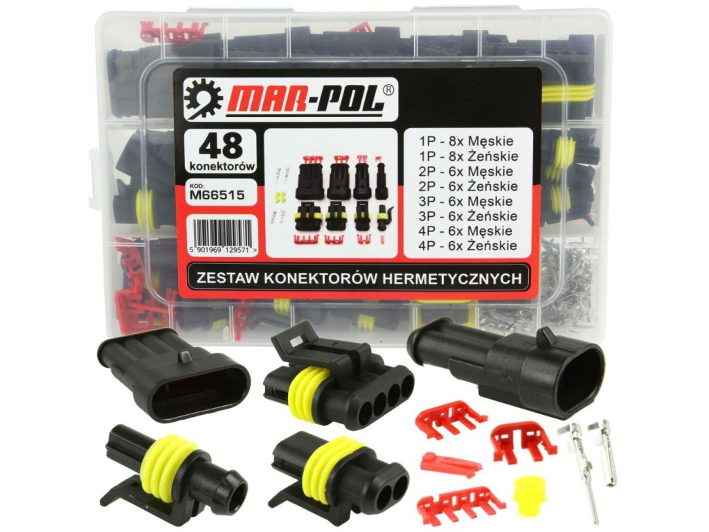 Konektory automobilové vodotěsné, sada 48ks MAR-POLSada čtyř druhů hermetických uzavřených konektorů pro každého automechanika, motomechanika, servisního technika, kutila...Tyto konektory byly vyvinuty tak, aby splňovaly stále rostoucí požadavky na bezpečnost a spolehlivost v oblasti elektrických...