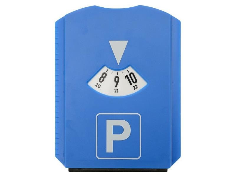Zegar parkingowy z wytrzymałego plastiku z obrotowym dyskiem. Trzy krawędzie zegara parkingowego wykonano jako ostrza skrobaczki, którą można używać do śniegu i lodu; bok z gumowym ostrzem jest przeznaczony także do wody. Dodatkowo na tylnej stronie przymocowano inne przydatne akcesoria: żeton do wózka sklepowego oraz miarkę do orientacyjnego pomiaru głębokości bieżnika opon.
