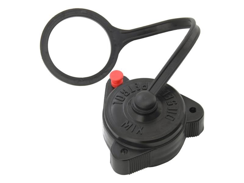 Plastowy korek do kanistra na paliwo. Korek składa się z trzech elementów: taśmy zabezpieczającej z miękkiego i elastycznego plastiku, kołeczka pozwalającego określić zawartość kanistra oraz samego korka służącego do zamknięcia kanistra.