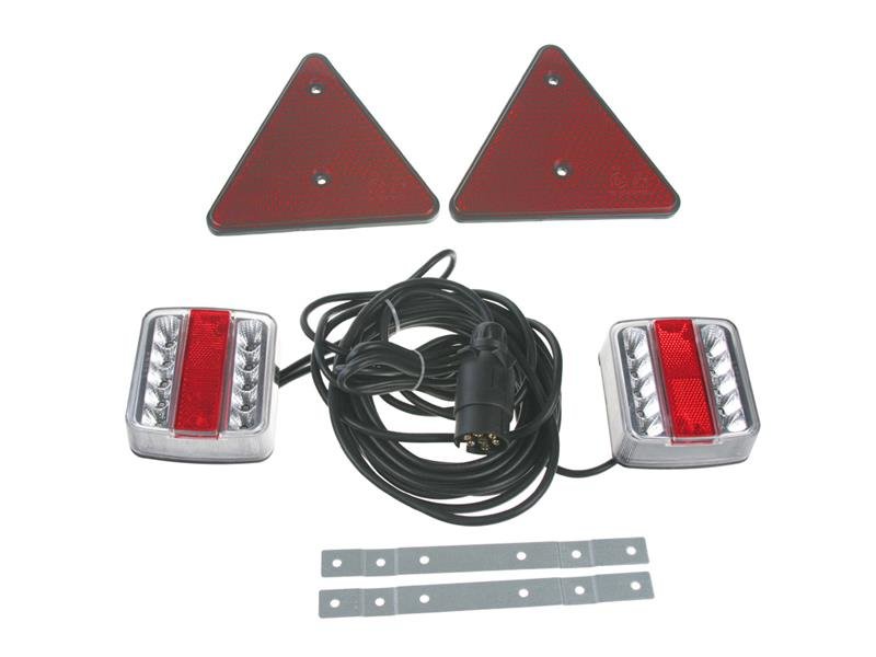 2x sdružená lampa zadní LED s odrazovým trojúhelníkem včetně kabeláže a připojení 7pin DIN konektorem. Určeno např. pro označení nadměrného nákladu, přívěsného vozíku nebo jízdních kol upevněných na nosiči nebo 5-tých dveřích.