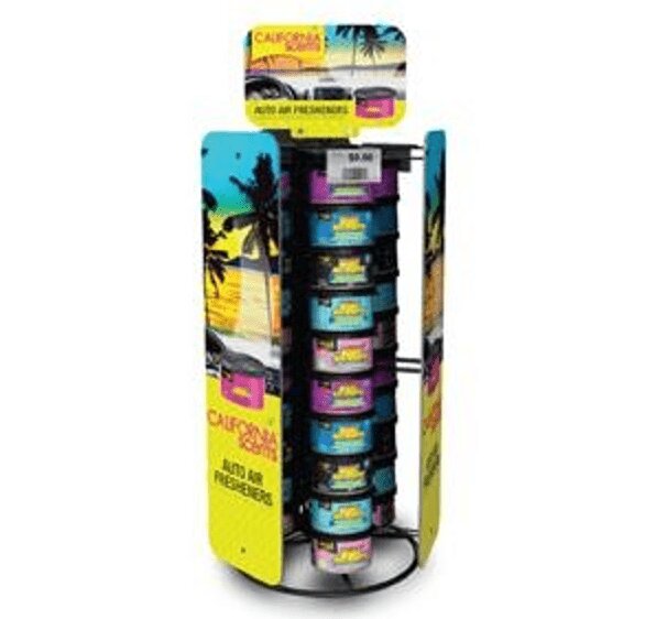 Trojstranný stojan na plechovičky California Scents Counter Spinner 3 SIDED - kompletne pojme 30 ks plechovičiek (z každej strany 10 ks). przeczytaj całość