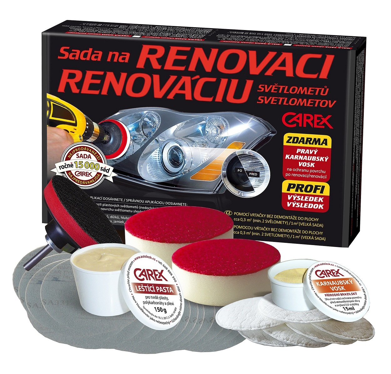 Tato sada se používá u poškrábaných, popraskaných, či jinak hloubkově poškozených světlometů. Broušením a následným leštěním se navrací čirost, povrchová zašedlost, zežloutnutí i zmatnění světlometů. Pomocí běžné, či aku vrtačky odstraní vrypy, důlky od kamínků, oděrky, praskliny a jiné povrchové vady u součástí z tvrzených, nejen čirých, plastů určených pro motorismus, apod. Leštění se provádí pouze mechanicky, bez chemického znehodnocení povrchu světlometu. Jelikož je leštící pasta CAREX na vodní bázi, není tedy chemicky agresivní, jako pasty konkurenční, určené vesměs pro leštění ruční.