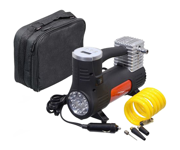 Vzduchový kompresor s digitálním měřičem tlaku a režimem automatického huštění - na displeji se nastaví požadovaný tlak a po jeho dosažení se kompresor sám vypne. Kompresor je vhodný k huštění pneumatik osobních automobilů, dodávek i vozů 4x4. Součástí balení je praktická, na zip uzavíratelná brašna a přídavné adaptéry pro různé použití (huštění míčů, matrací apod.). Kompresor je také vybaven LED světlem bílé barvy a výstražným (blikajícím) LED světlem červené barvy.