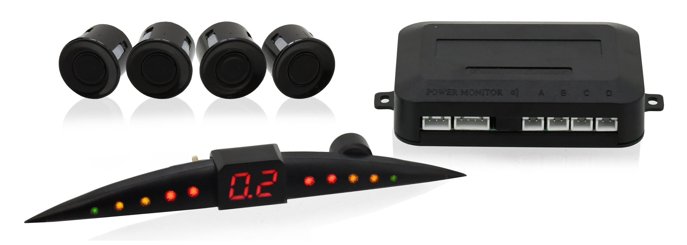 Balení obsahuje displej, řídící jednotku, 4 senzory pro montáž do zadního nárazníku, odpovídající kabeláž a vrták odpovídajícího průměru.