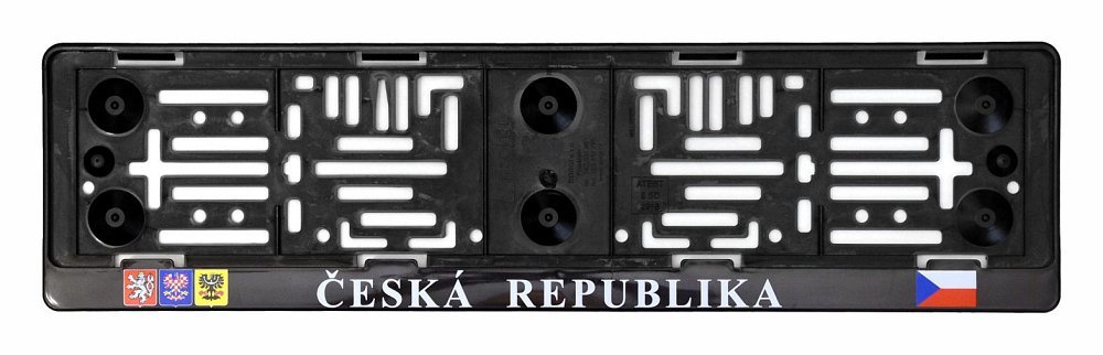 Plastowa podkładka pod tablicę rejestracyjną pojazdu (państwową tablicę rejestracyjną), otwory do uniwersalnego montażu. Z herbami i z napisem Republika Czeska. przeczytaj całość