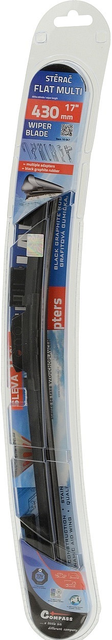 Plochý stěrač nové konstrukce, který zajišťuje důkladné a rovnoměrné stírání. Speciální uchycení, díky kterému lze pomocí přiložených adaptérů použít tento stěrač pro řadu různých zakončení ramen stěračů. Balení á 1 ks ve speciálním "otevíracím" blisteru. Tento typ plochého stěrače je osazen gumičkou s černým grafitem, umožňuje i její výměnu.