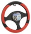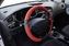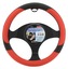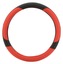 Stylowy pokrowiec na kierownicę o unikalnym wykonaniu, w pastelowo-czerwonym kolorze z czarnym podkładem i pastelowo-czerwonym przeszyciem.