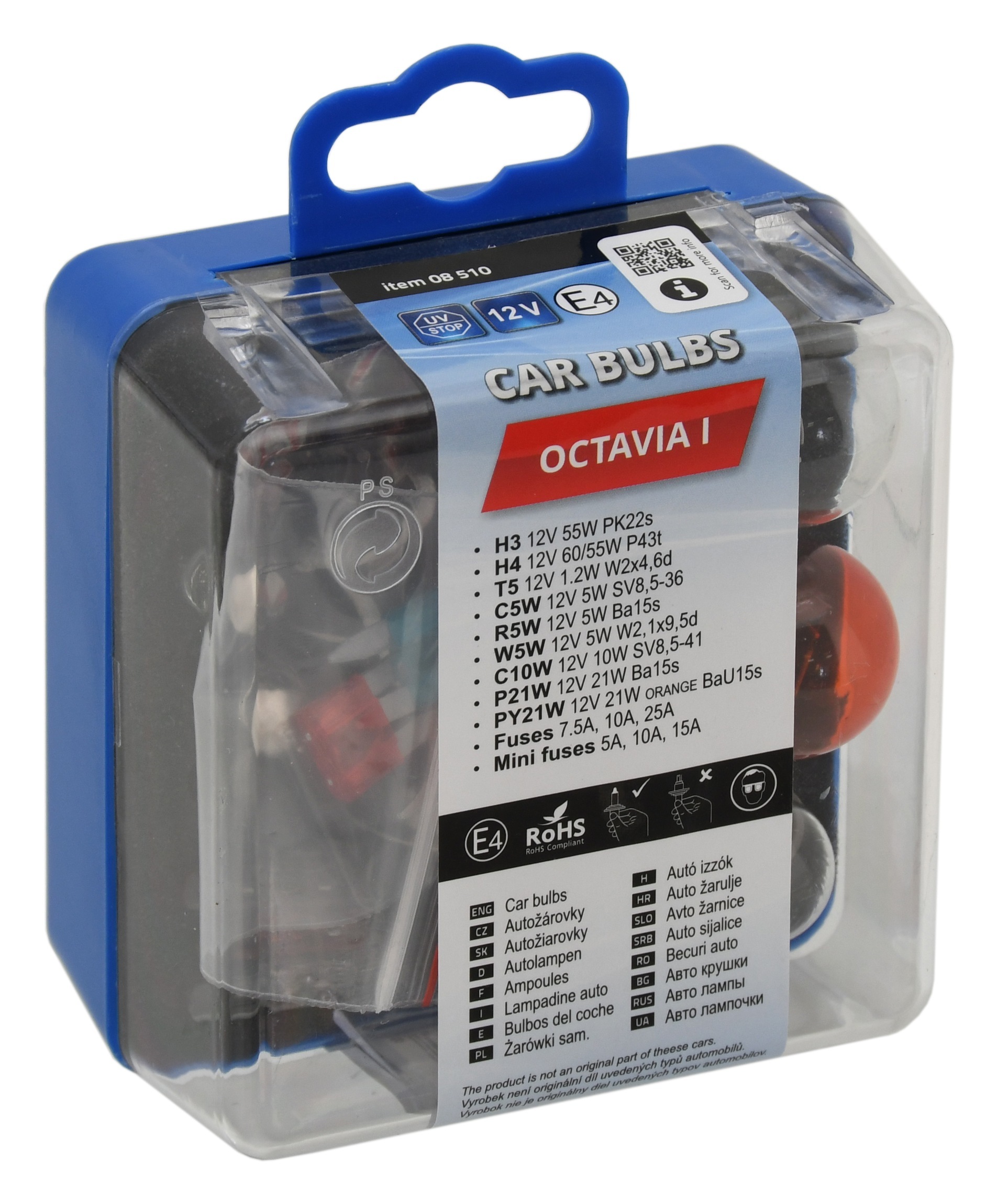 Plastowe pudełko z zapasowymi żarówkami samochodowymi, homologacja E.